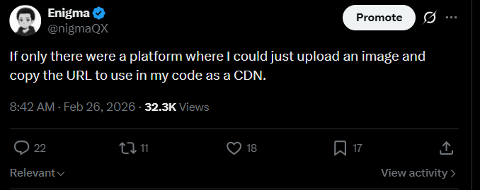 I asked a question on X that went a bit viral about image hosting, and the consensus led me here. It’s a CLI tool that uploads images to Cloudinary and gives you back the CDN URL instantly. Trying to prevent manual uploads. Just copy image path, run a command and get your CDN url.